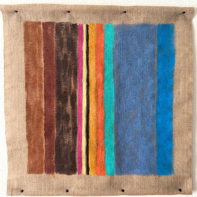Die integrierte Rahmung besteht aus einer Holzlatte, die mit Jutegewebe umrahmt ist. Die Künstlerin hat das Bild